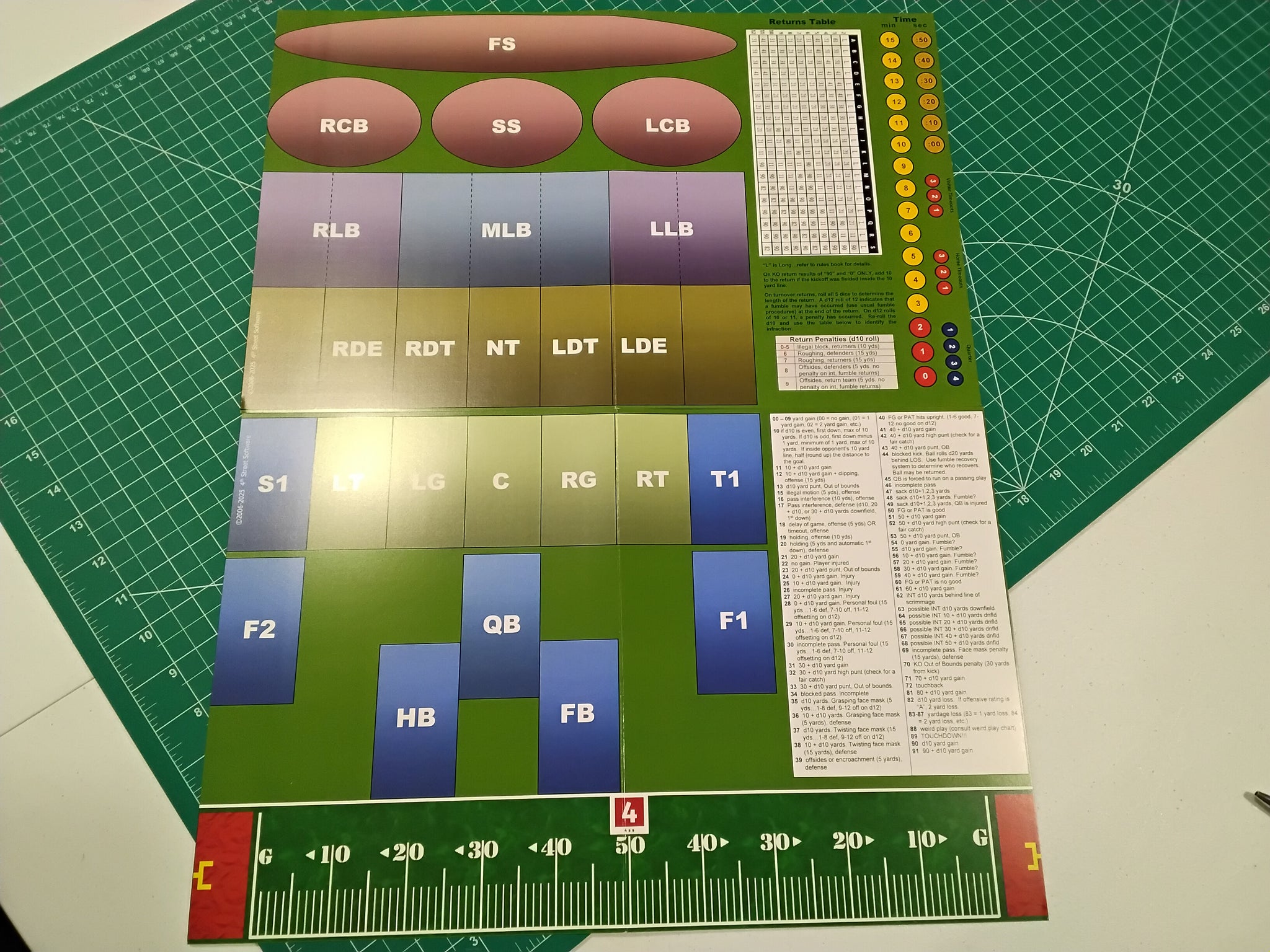 New Product 9/7/2024!  Deluxe Football Fields are now ready for shipment!  These are an upgrade over the 2-part "jumbo" fields that come with the game, and are mounted on 2mm book board with a black, vinyl backing.  A set includes two bi-fold boards which are set next to each other to make a 17" x 22" playing surface.  Each board is made by hand and there may be slight differences, including the printed area itself.  See the dropdown for ordering information.