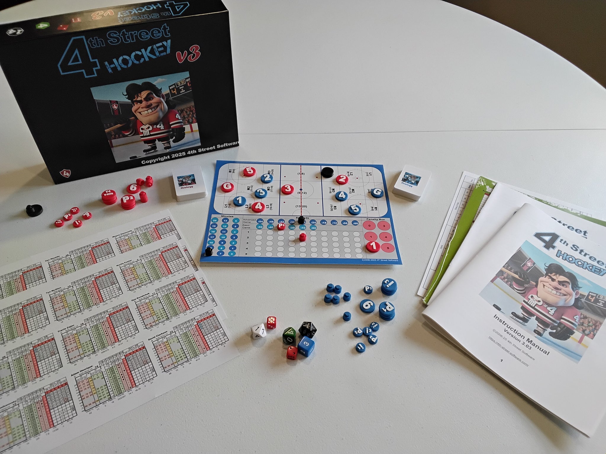 Simple symbols, such as "▲" and "◆" are used to direct the action on the ice, while other symbols such as "②" help identify the players involved in play. Six different dice help to direct traffic and find results in a logical manner.